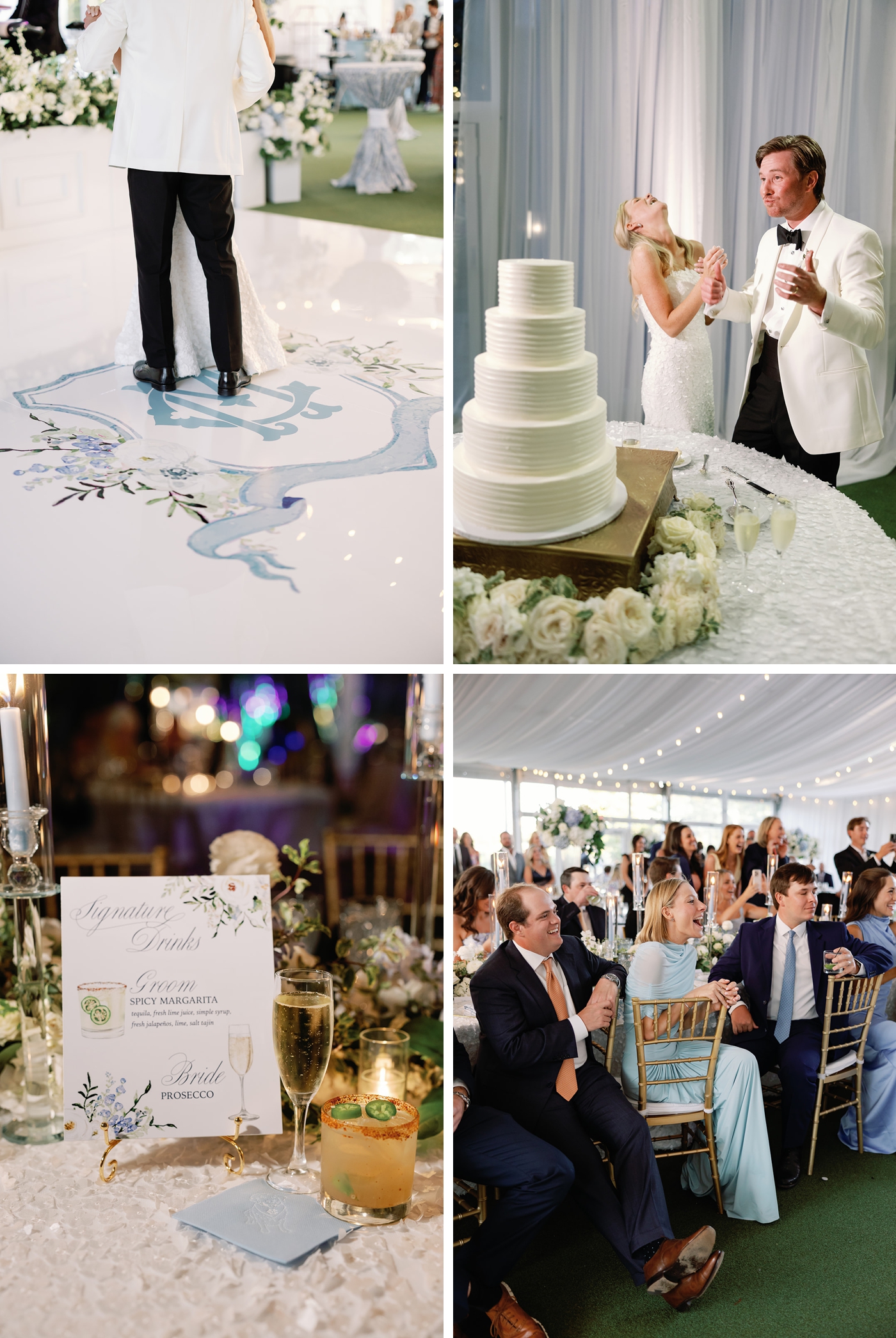 Each table was anchored by tall glass candleholders with dusty blue tapers, while long centerpieces layered greenery with soft white florals. At the center of it all was a glossy white dance floor featuring the couple’s custom monogram, a polished focal point for the evening’s celebration.
