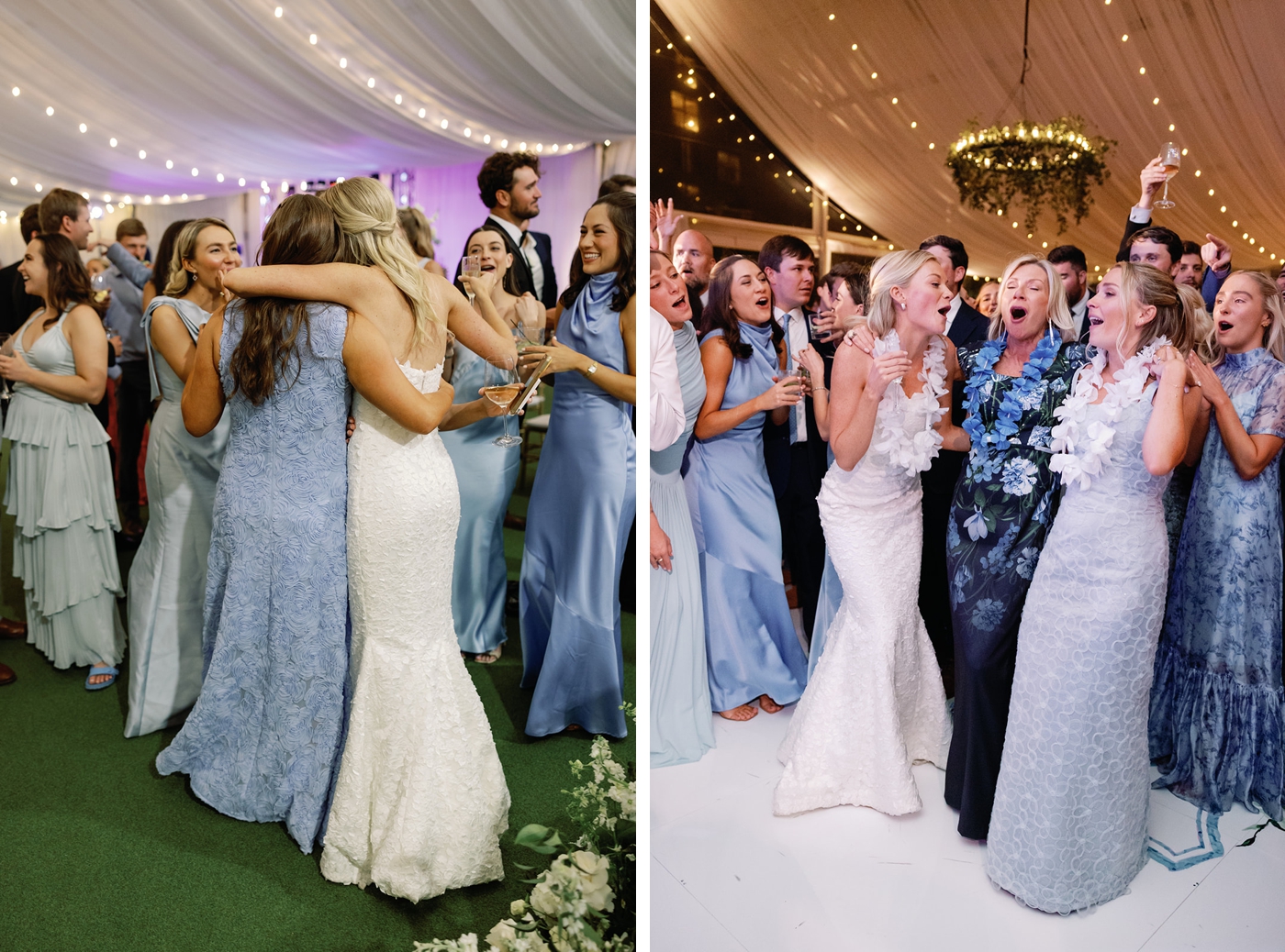 Each table was anchored by tall glass candleholders with dusty blue tapers, while long centerpieces layered greenery with soft white florals. At the center of it all was a glossy white dance floor featuring the couple’s custom monogram, a polished focal point for the evening’s celebration.
